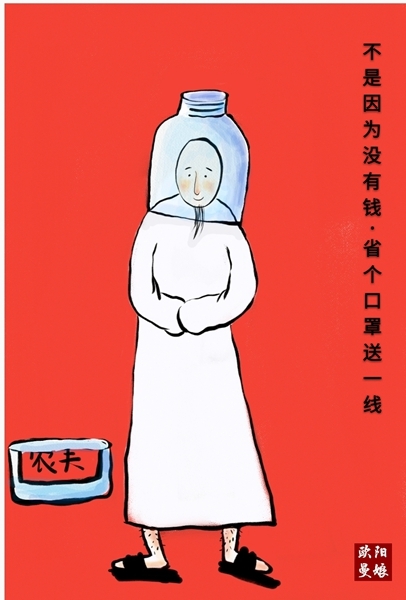 对着鱼缸垂钓、用矿泉水瓶自制防疫面罩、在家独饮、用村村响宣传疫情防护、在一线抗击疫情的白衣天使……在12张漫画作品中,有普及疫情防护的知识、有趣味的“宅”生活场景、有反映前线医务工作人员的工作状态。