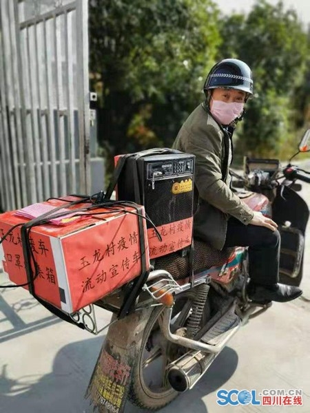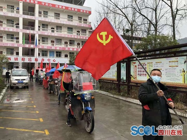 在射洪市涪西镇玉龙村,村支部书记罗俊组织村“两委”干部和普通党员群众成立“防控疫情流动宣传车队”。他们骑着自家的摩托车,车头挂着党旗,车尾放着自家小音箱走门串巷,挨家挨户普及疫情防护知识。