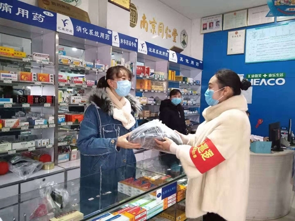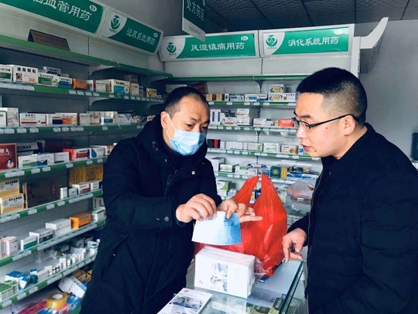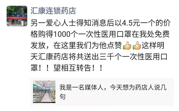 然而,1月27日,他向镇政府捐赠1300只口罩;1月30日到31日,他向碧山社区和踏水社区捐赠3000余只口罩;2月1日,发放完店里员工的口罩后,他又通过自己的药店向镇上的居民免费发放口罩,一人2个。直到所有口罩都送完,他才想起,自己又没把家人“算进去”,只好向员工求助。
