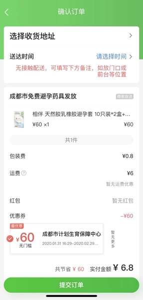 四川在线消息(记者 李寰)据成都市卫健委介绍,成都市计生保障中心利用“京东到家”“成都市免费避孕药具发放”门店,为群众增加一个通过网络领取免费避孕药具的新方式,提供物流送货上门服务,满足非常时期“宅”在家里群众的基本需求。