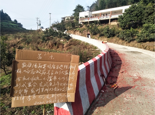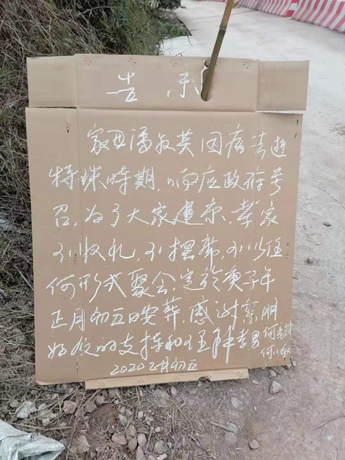 一家人同意后,合力找来纸板和粉笔写了两块告示牌,赶在29日一早跑到离家门口几百米远的位置,分别将告示牌摆在路的两头。