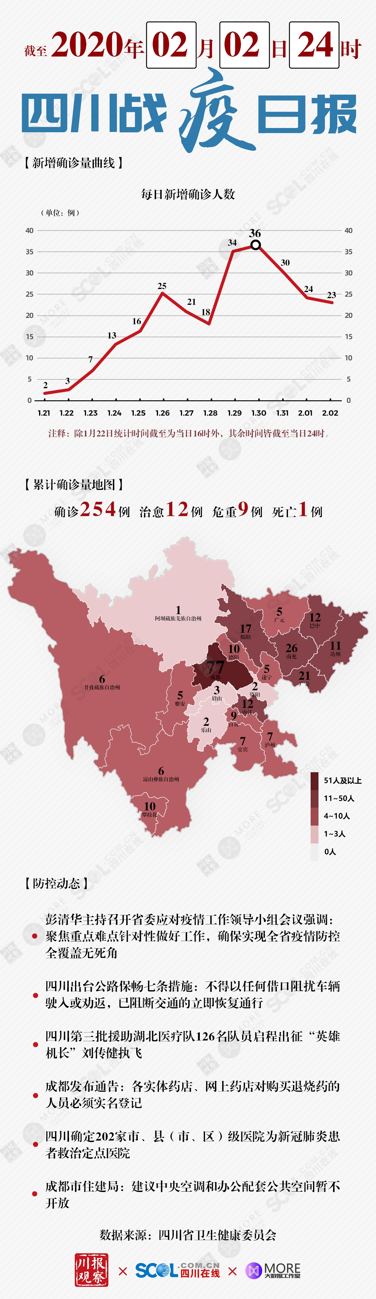 截至2月2日24时,我省累计报告新型冠状病毒感染的肺炎确诊病例254例,涉及21个市(州)。其中成都市77例、南充市26例、广安市21例、绵阳市17例、内江市12例、巴中市12例、达州市11例、攀枝花市10例、德阳市10例、自贡市9例、泸州市7例、宜宾市7例、甘孜州6例、凉山州6例、广元市5例、遂宁市5例、雅安市5例、眉山市3例、乐山市2例、资阳市2例、阿坝州1例。