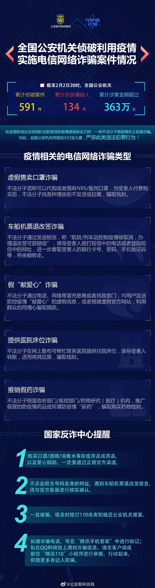 记者梳理发现,疫情发生以来,全国多地均出现不法分子利用疫情名义实施诈骗。据公安部刑侦局通报,截至2月2日20时,全国公安机关累计侦破案件591件,抓获嫌疑人134名,累计涉案金额363万。警方提示,疫情相关的电信网络诈骗类型包括以下几类。