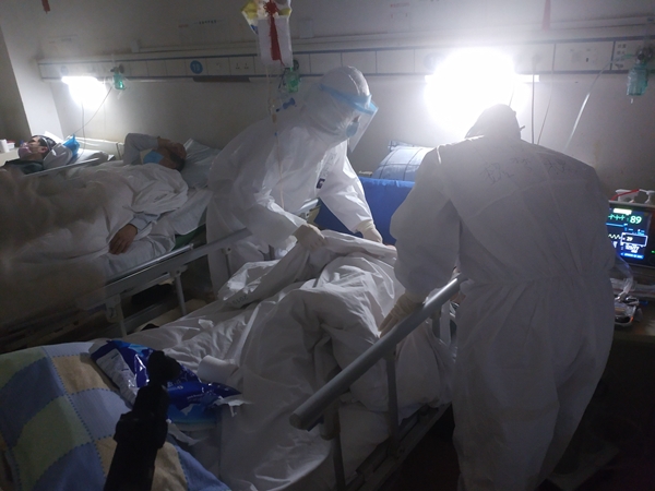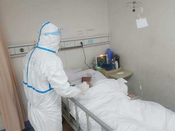 2月3日零点51分,防护服包裹下的川大华西医院重症医学科医务人员吴孝文后背已完全湿透,他介绍,按照常规重症病房配备,病人与护士的比例应该是1:2.5-3人,在这里却完全相反,2-3个病人配1名护士。加上重症病区以45岁以上的中老年人居多,除了要密切关注病人生命体征,进行常规的医学操作以外,还要协助行动不便的病人翻身、小便,防止病人意外跌倒、晕厥。在人员紧缺的情况下,病区工作强度非常大。