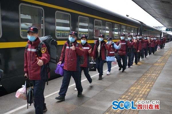 四川在线消息(记者 李寰 摄影 杨树)2月4日下午5时,70余名国家(四川)紧急医学救援队队员(四川省第四批援助湖北医疗队)登上了从成都开往武汉的列车。
