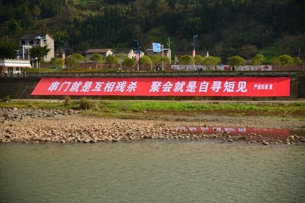 “乖,戴好口罩”,在荥经大桥出县城方向,一幅硕大的暖心标语格外醒目,过往的人员车辆都能很轻易的看到。在城区各街道、在县城旁边的河堤上,记者随处可见创新的标语横幅,“控制疫情,咱不出门,待在家里,安逸无穷”“串门就是互相残杀,聚会就是自寻短见”“麻将茶馆人又多,一人传染一大窝”......一批接地气、易接受的标语让县城居民过目难忘。