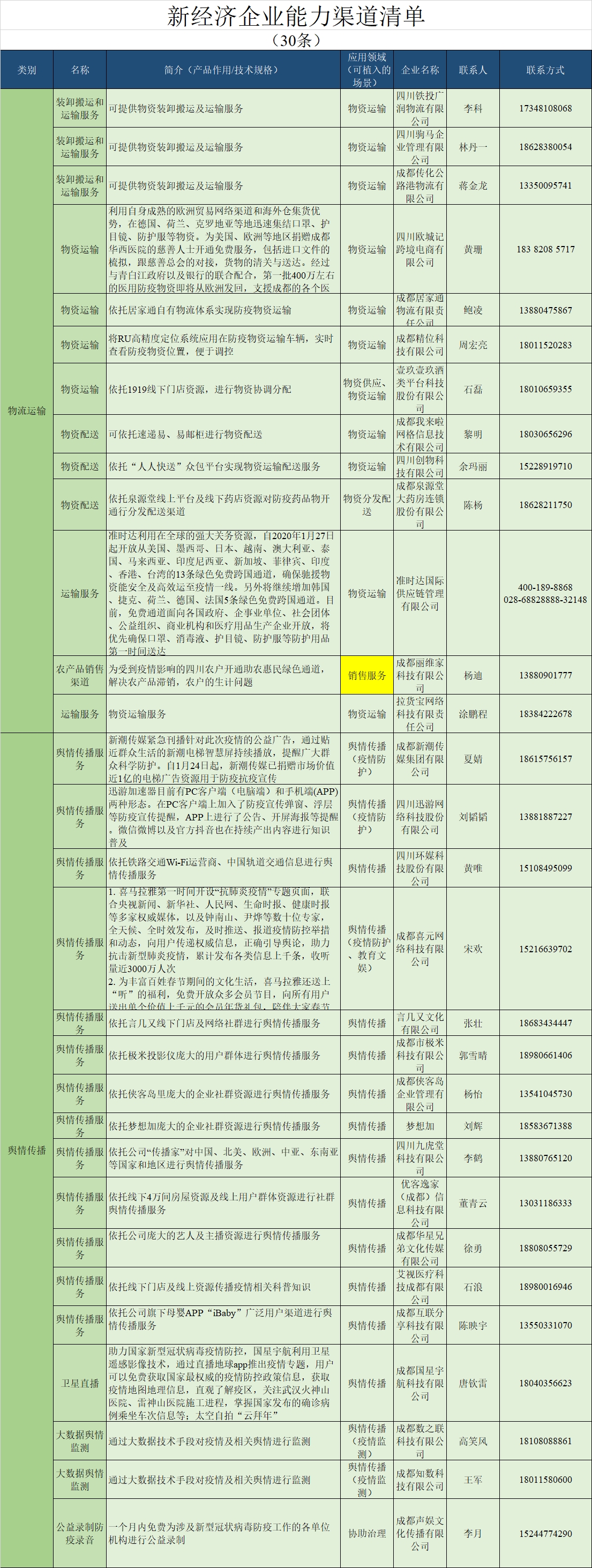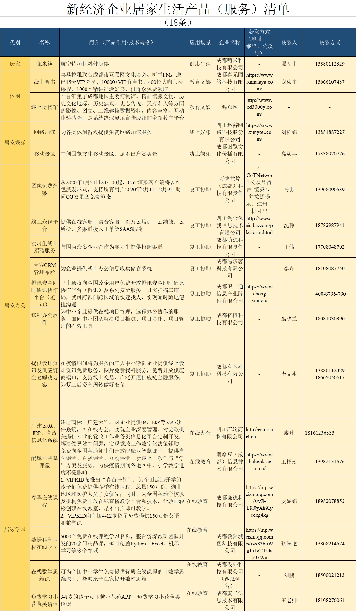 该清单系统梳理出成都市新经济企业疫情防控、居家生活产品(服务)、新经济企业能力渠道三份子项清单,发布各类清单信息共计111条,遴选了一批适用于抗击疫情背景下各类场景的产品和服务,涵盖物资供应、舆情传播、物流运输、远程诊疗、教育文娱等各个行业领域。