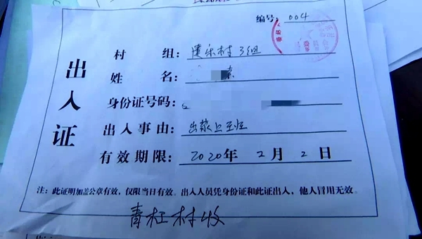 “出入证”上须写清楚村民姓名、身份证号码、所属村组及出入理由和有效期限,并且需要加盖本村公章。现场工作人员还告诉记者,目前,除了垃圾运输车、应急车辆、物资调配车和供应化肥车辆以外,外来车辆一律不予放行。