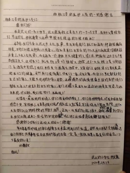 来信是随家人到雅江旅游的武汉小朋友柯贝霖写的,因为目前隔离在雅江县驿都大酒店,11岁的柯贝霖只能自己写好信,拍成照片传出来。