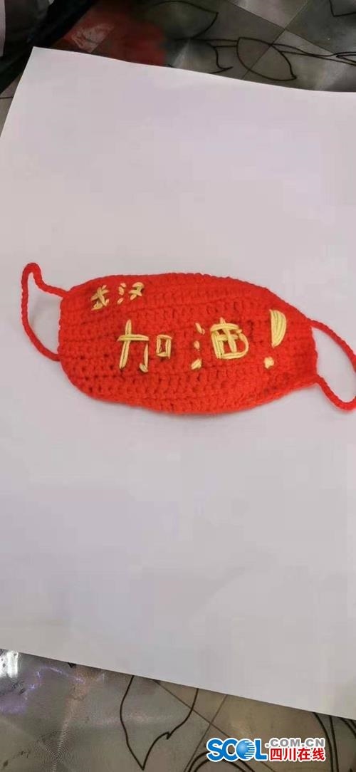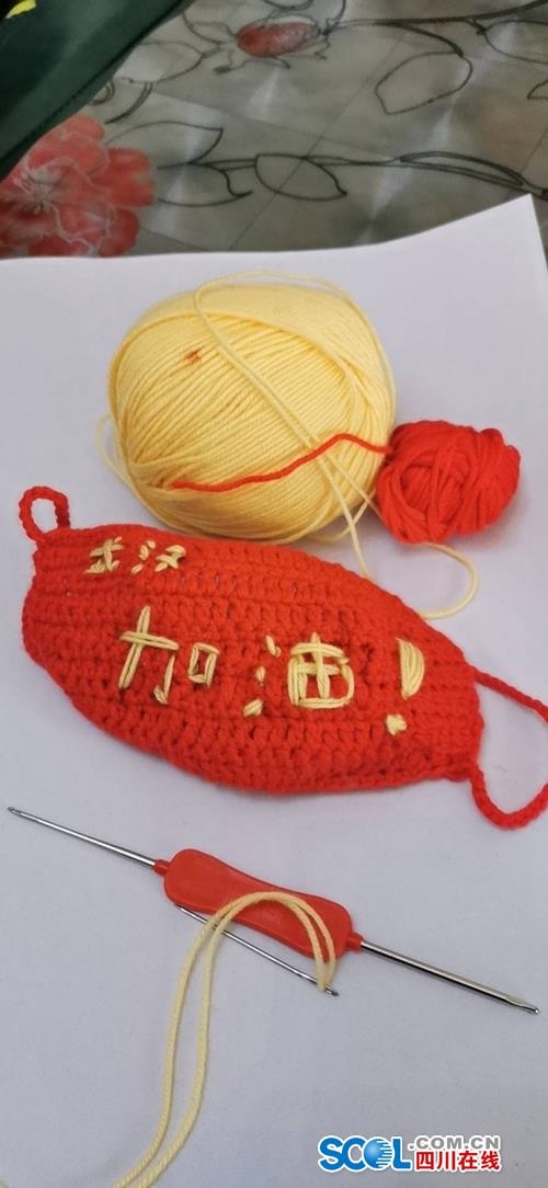 眼看家里的口罩快用完了,金彩霞灵机一动,利用工作空余时间,在网上学习了针织口罩。然后,她就带着金宇涵来一起做针织口罩。口罩有三层,最里面一层用的是纱布,中间用的是保鲜膜,外面一层是红色毛线,还特地绣上“武汉加油”四个字。“这不仅可以用来隔离病毒,还想为武汉加油鼓劲,也为大家加油鼓劲。”金彩霞说。