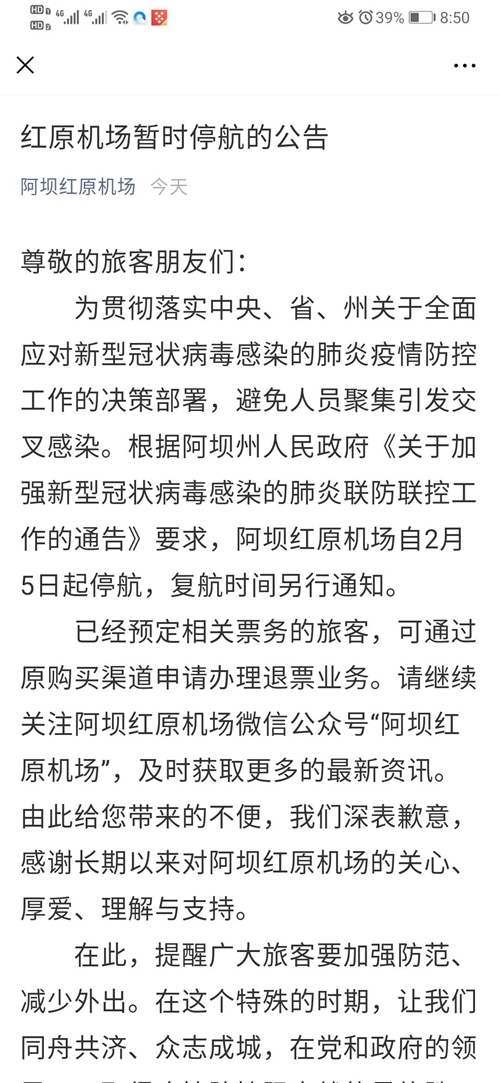 四川在线消息(记者 徐中成)2月5日,阿坝红原机场有限责任公司在官方公众号上发布公告,为贯彻落实中央、省、州关于全面应对新型冠状病毒感染的肺炎疫情防控工作的决策部署,避免人员聚集引发交叉感染,根据阿坝州人民政府《关于加强新型冠状病毒感染的肺炎联防联控工作的通告》要求,红原机场从2月5日起停航,复航时间另行通知。