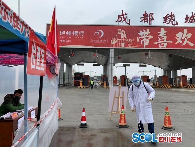 “到这边来!”下午2点,成都绕城高速成金站,一辆川Y牌照的小车刚驶出收费口,就被引导到路边。待司乘人员下车后,两名防疫检测工作人员随即上前,一人检测体温,一人则喷洒消毒水对车体进行全面消杀。