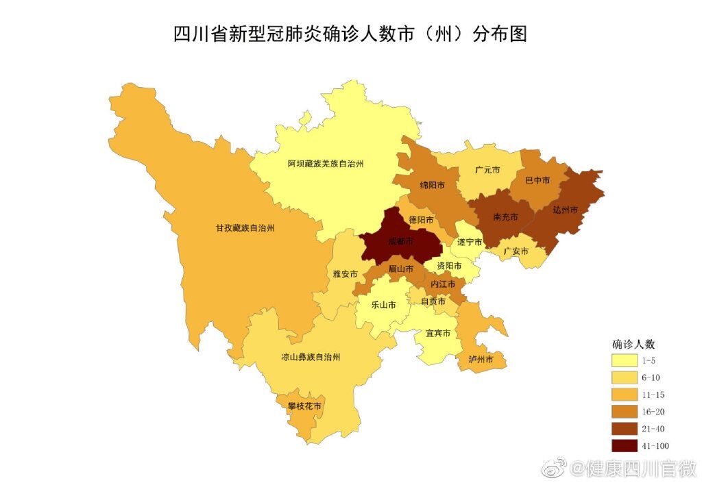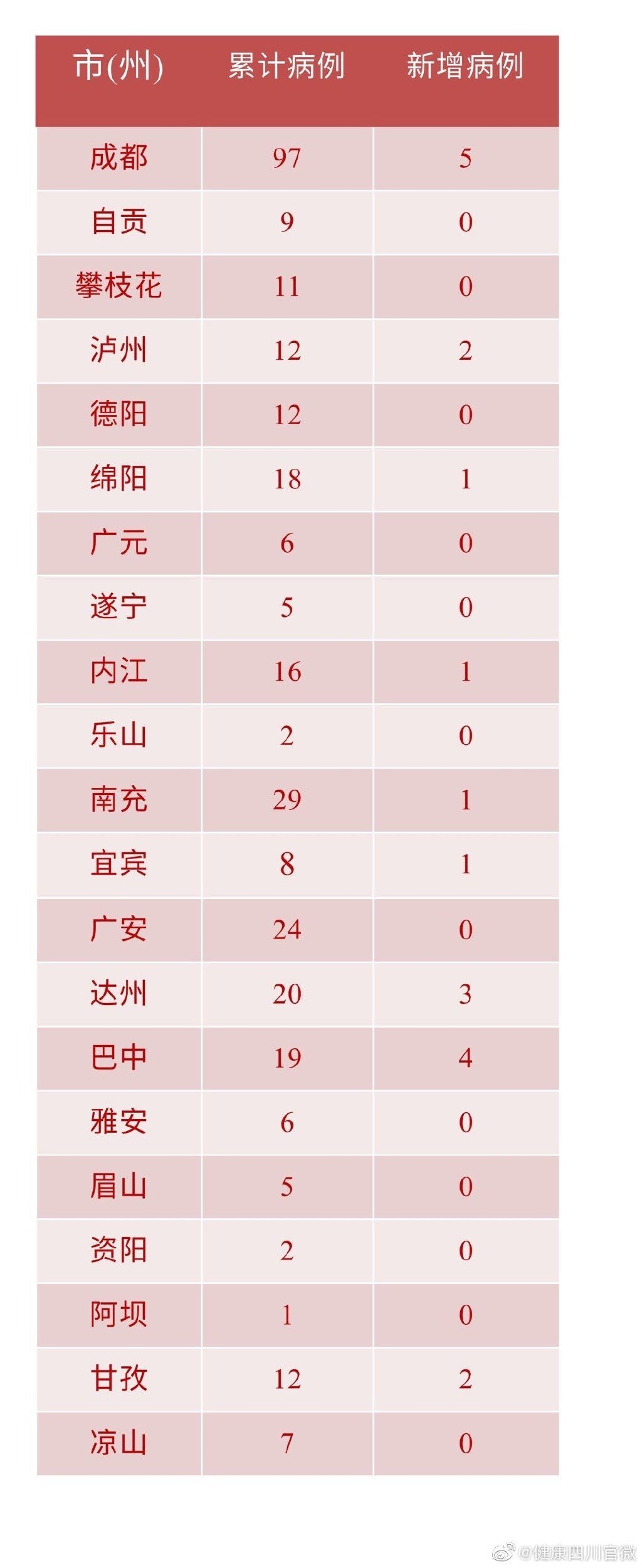 新增确诊病例中,成都市5例、巴中市4例、达州市3例、泸州市2例、甘孜州2例、绵阳市1例、内江市1例、南充市1例、宜宾市1例。