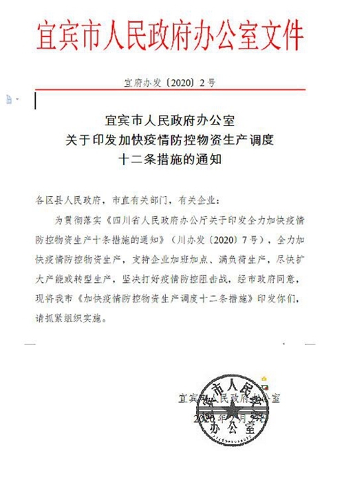 四川在线消息(滕雪飞 曹洋 记者 颜婧)继四川省出台《全力加快疫情防控物资生产十条措施》后,宜宾市日前出台《加快疫情防控物资生产调度十二条措施》,支持企业加班加点、满负荷生产,尽快扩大产能或转型生产,坚决打好疫情防控阻击战。