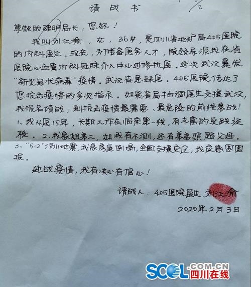 四川在线消息(记者 寇敏芳)“我叫刘江渝,如果省局抽调医生支援武汉,我报名请战……”近日,省地矿局405医院的内科医生刘江渝写下了请战书,希望能够支援武汉抗疫一线。