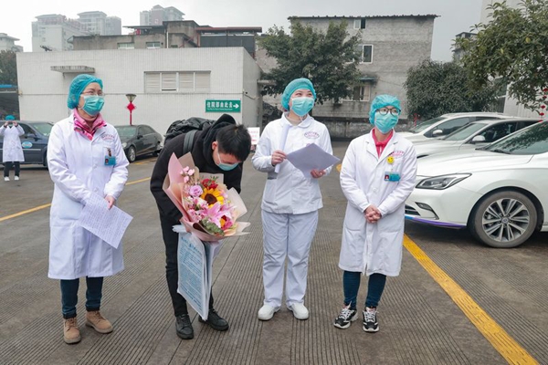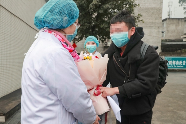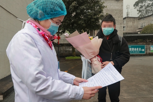 8日上午10点20分,高某走出雅安市人民医院三院区住院部,在医护人员的指导下签署了《住院病人离院责任书》等。“祝你顺利康复!”该院感染科主任龙志玲为高某献上一束鲜花。随即,高某将在住院期间写的感谢信递给龙志玲。“你字还写的不错。”龙志玲盯着眼前这个“90后”的小伙,咯咯地笑起来。“高某的成功治愈,鼓舞了其他患者,也鼓舞了我们医务工作者战胜疫情的信心。”龙志玲说。