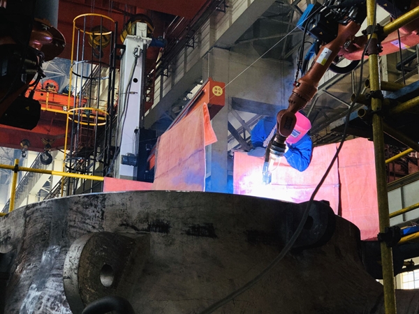 高温阵阵、电光闪闪,2月8日,在东方电气集团东方电机有限公司重跨车间,工作人员正操作弧焊机器人,为国家重点工程长龙山抽水蓄能电站水轮机球阀进行焊接工作。受疫情影响,东方电机企业复工人数由原本的1000人缩减至500人左右,目前,车间一名工人需要同时操作两台弧焊机器人,这就要求他们比平时更加地细致、更加地专心,才能保证产品的质量。