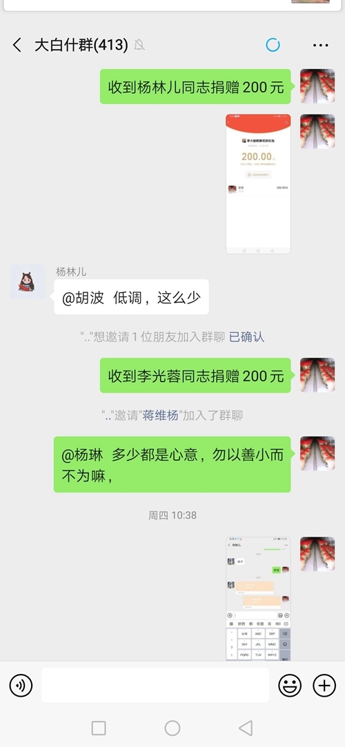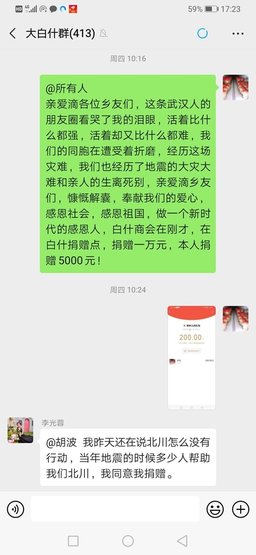 “亲爱滴各位乡友们,这条武汉人的朋友圈看哭了我的泪眼,活着比什么都强,活着却又比什么都难,我们的同胞在遭受着折磨,经历这场灾难,我们也经历了地震的大灾大难和亲人的生离死别,亲爱滴乡友们,慷慨解囊,奉献我们的爱心,感恩社会,感恩祖国,做一个新时代的感恩人,我们正在筹建的白什商会,捐赠一万元,我本人捐赠5000元!”在家乡北川白什乡的乡友群里,胡波发布了这条消息后,立即得到了该乡农民工们积极响应。