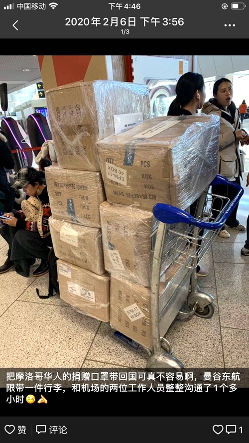 “太难了!”口罩虽然买到了,但当再次回忆起运送过程时,杨世骏不断地感叹道。“当时好多飞国内的航班都停运了,只能找团队‘人肉’带回来。我们到处打听,才找到一个还停留在卡萨布兰卡的昆明团队,答应帮我们把口罩托运到曼谷,再从曼谷带回昆明。”