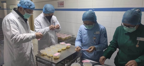 记者穿过20米左右的缓冲区走廊,带有暖心元宵的餐车到达隔离病房区。送餐的医护人员通过特制的传递窗口将元宵送到隔离病房中的病人。窗前的短暂停留里,医护人员和病人点头致意,充满温馨的气息。