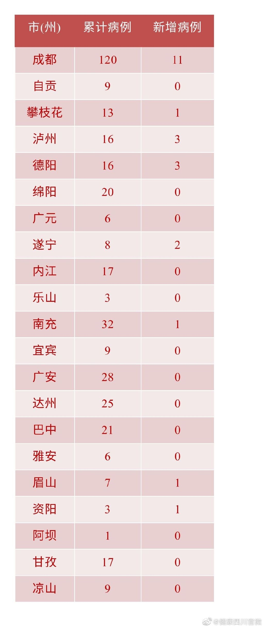新增确诊病例中,成都市11例、泸州市3例、德阳市3例、遂宁市2例、攀枝花市1例、南充市1例、眉山市1例、资阳市1例。