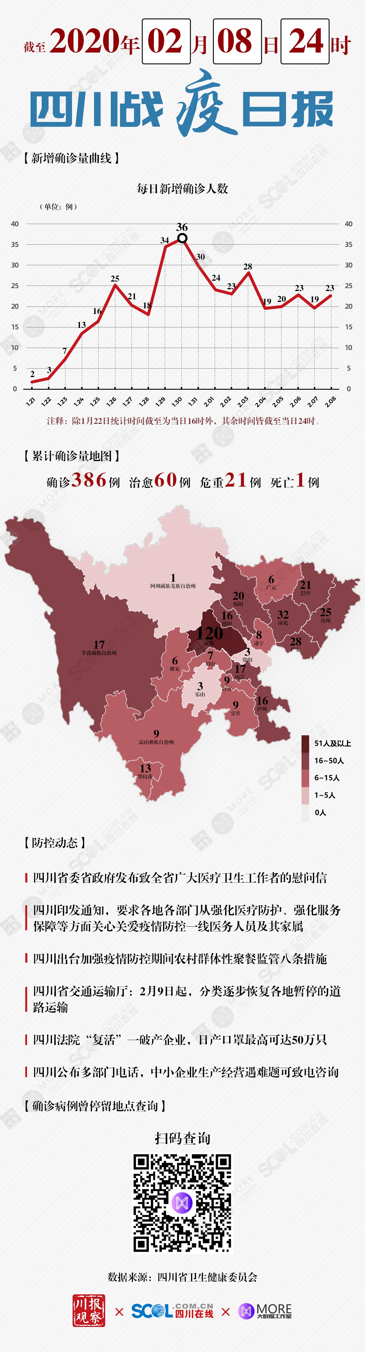 截至2月8日24时,四川省累计报告新型冠状病毒肺炎确诊病例386例,涉及21个市(州)、122个县(市、区)。