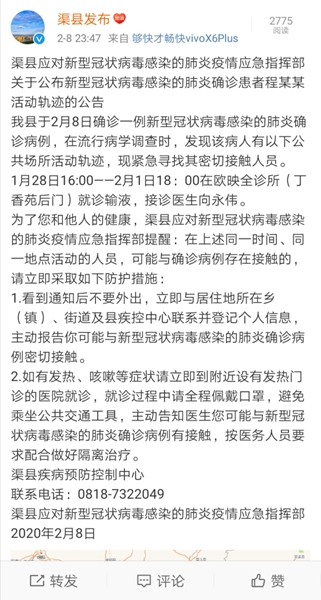 公告称,渠县2月8日确诊一例新型冠状病毒肺炎确诊病例,在流行病学调查时,发现该病人有以下公共场所活动轨迹: