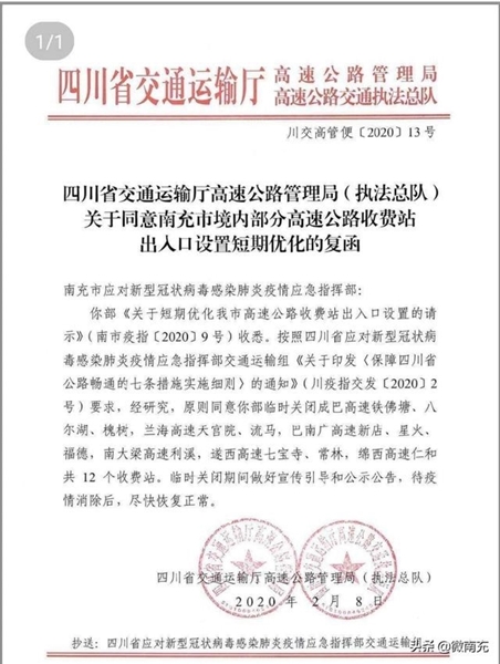四川在线消息(记者 蒲南溪)2月9日,记者从南充市应对新冠肺炎疫情应急指挥部获悉,四川省交通运输厅高速公路管理局(执法总队)同意南充市境内部分高速公路收费站出入口设置短期优化,具体情况如下:
