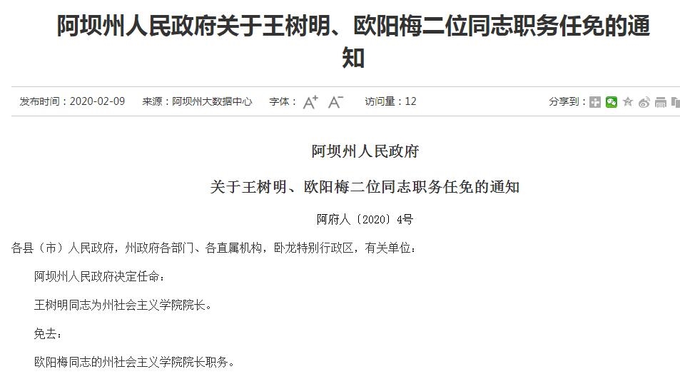 据了解,今年1月,王树明已升任阿坝州人民政府副州长,曾任阿坝州人民政府副州长的欧阳梅已调任南充市任副市长。