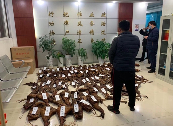 为彻底打掉贩卖窝点,巴中市市场监管局连夜联合公安部门组成执法组开展缜密调查和细致摸排,在当事人位于平梁乡相坪村四组的家中开展突击清查,查获待售的麂子干体11只、48Kg,獾39只、130kg,野猪干体61kg,共计各类野生动物制品266.8公斤。这起案件是疫情发生以来巴中市市场监管局一次性查获野生动物死体数量最多的一次。