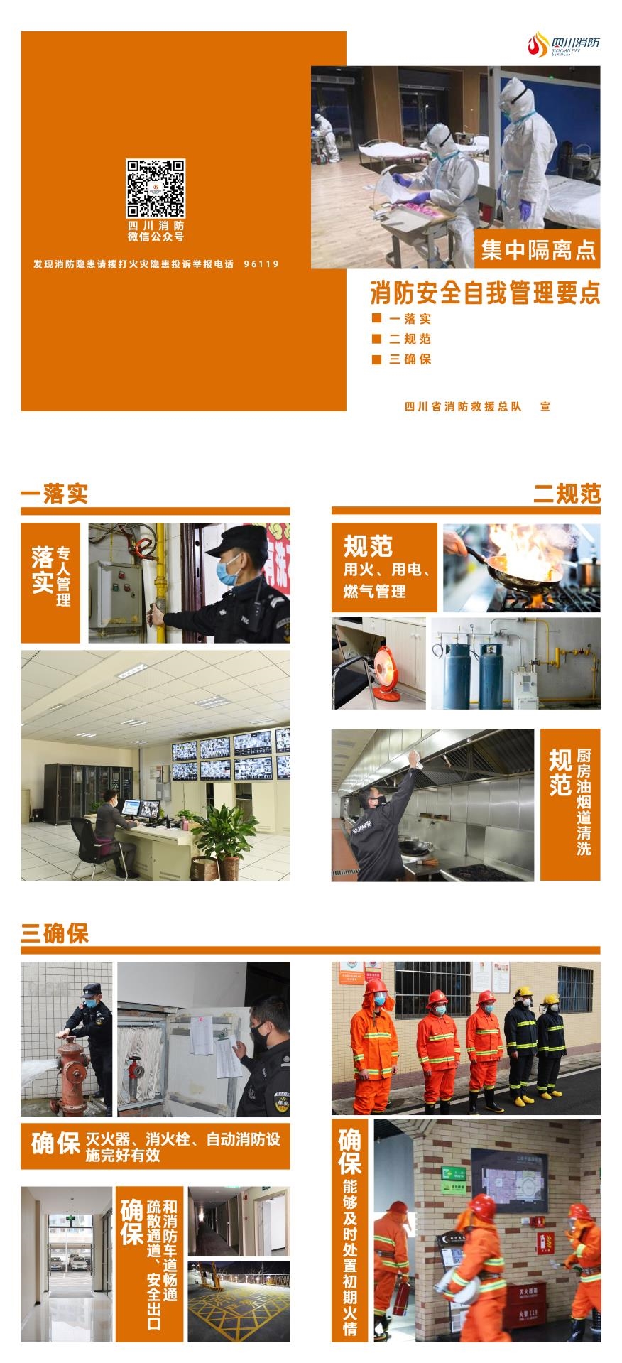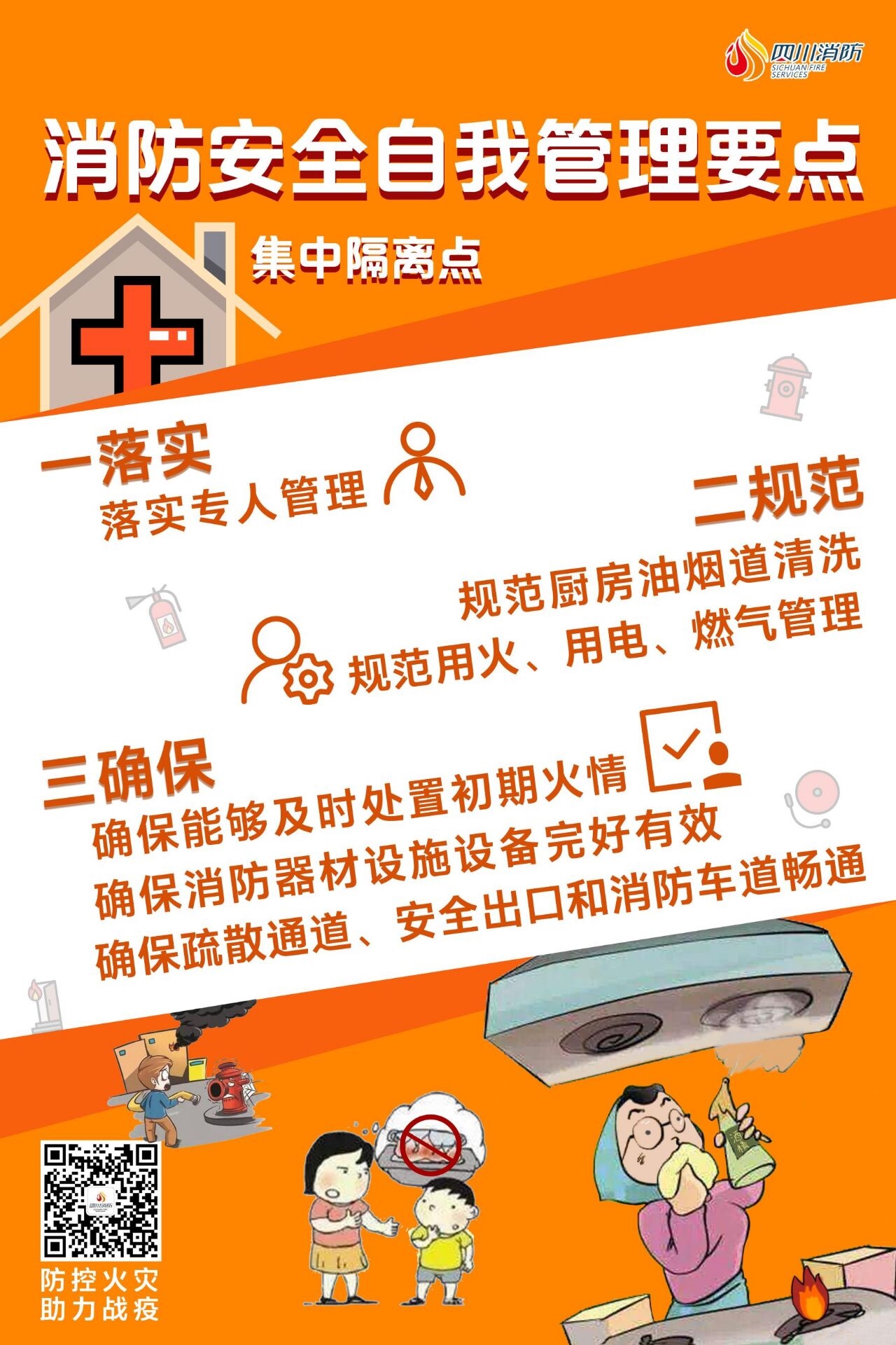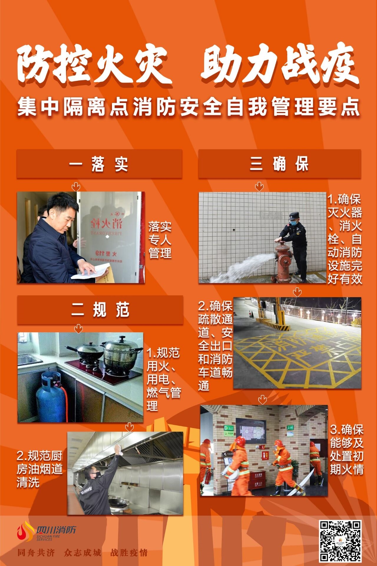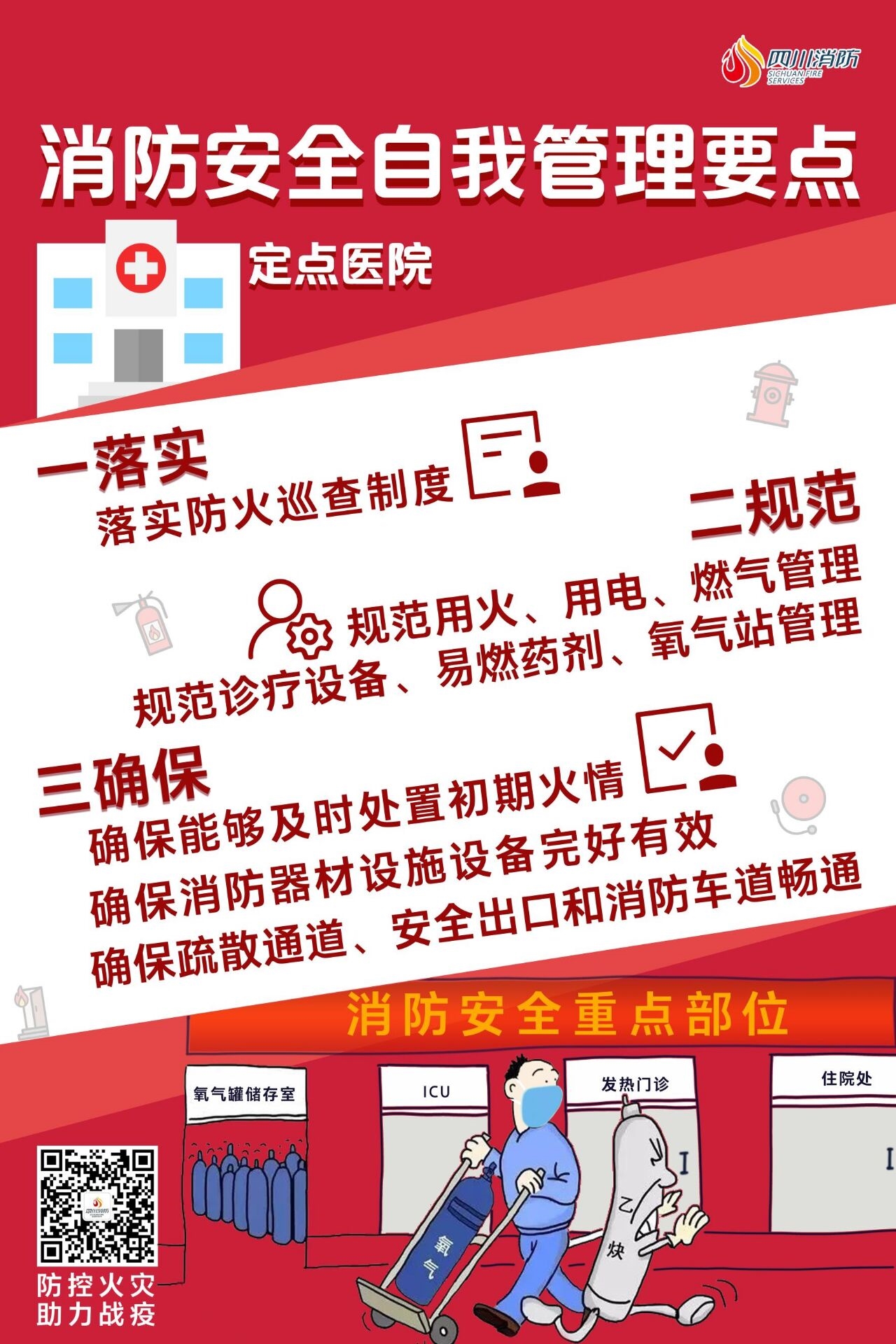 四川在线消息(记者 陈松)当前正值疫情防控的关键时期,为确保防疫重点场所不发生火灾,助力打赢防疫阻击战,四川省消防救援总队专门针对定点医院、集中隔离点及医疗生产企业“三类重要场所”,发布“一落实”“二规范”“三确保”等“123”重点提示,配套推出消防宣传海报和指导手册,便于社会各有关单位场所开展安全自查和自我管理。