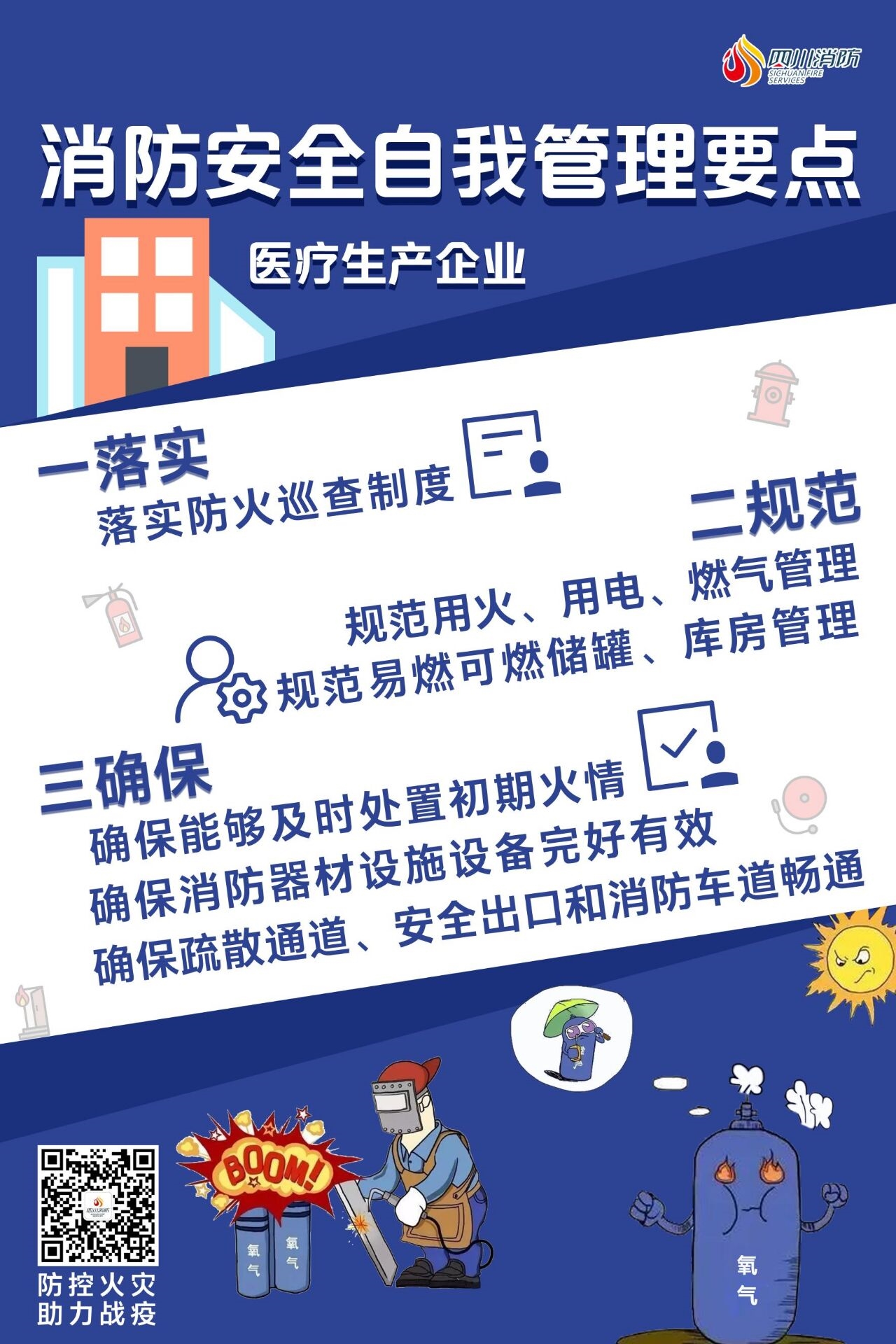 针对医疗生产企业,做到一落实,即落实防火巡查检查;二规范,即规范用火、用电、燃气管理,规范易燃可燃储罐、库房管理;三确保,即确保灭火器、消火栓、自动消防设施完好有效,确保疏散通道、安全出口和消防车道畅通,确保能够及时处置初期火情。