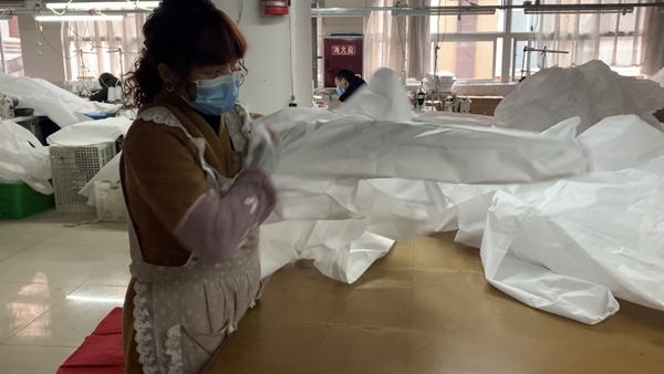 成都鑫昌巨服饰有限公司负责人徐辉均介绍,企业承接下2万件一次性隔离服的订单后,马上召集当地工人加班加点展开生产,目前每天的产量稳定在800件左右,预计在2月20号可以完成全部生产任务。