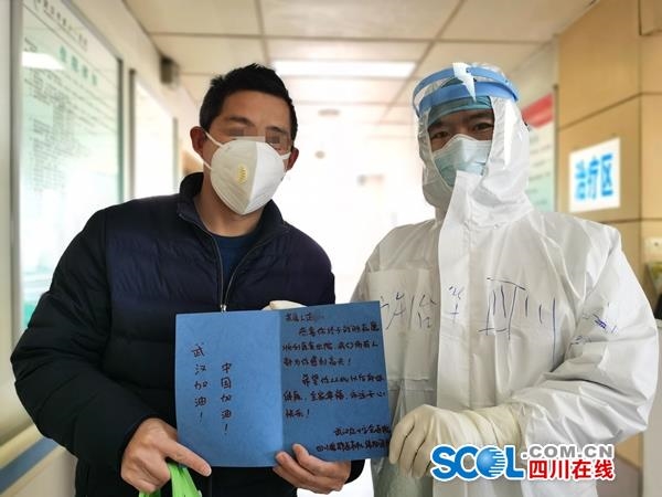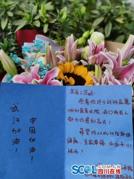 2月8日,范先生(左)从武汉市红十字会医院出院,绵阳医疗队为他送上的节日贺卡和鲜花。