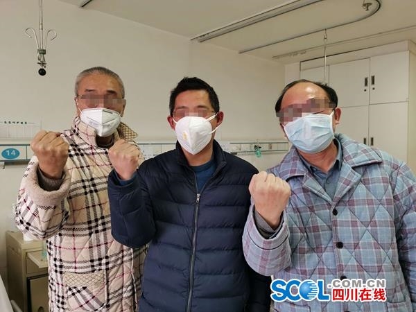 2月8日,即将出院的范先生(中)为病房其他病友加油打气。
