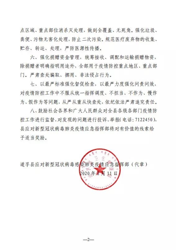 八、鼓励社会各界和广大人民群众对全县各级各部门疫情防控工作进行监督,对发现的问题进行投诉、举报(电话:0836—7122450), 县应对新型冠状病毒肺炎疫情应急指挥部将对有价值的线索给予适当奖励。
