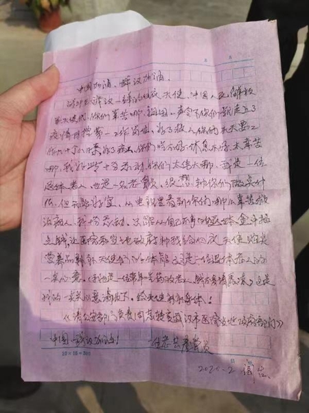 战斗在武汉一线的白衣天使、中国人民解放军天使们,你们辛苦了。祖国一声令下,你们就走上了疫情防控第一线工作岗位。为了救人,你们天天需要工作十几个小时。为了病人,你们吃不好、休息不好,我十分感动。我是一名退休老人,也是一名共产党员,很想帮你们做点什么。只能从自己不多的退休金中抽点钱,让医院和当地政府帮我给白衣天使购买营养品,补补天使们的体能,这是一位退休老人的一点心意(我也是一位常年吃药的老人,钱不多请原谅)。