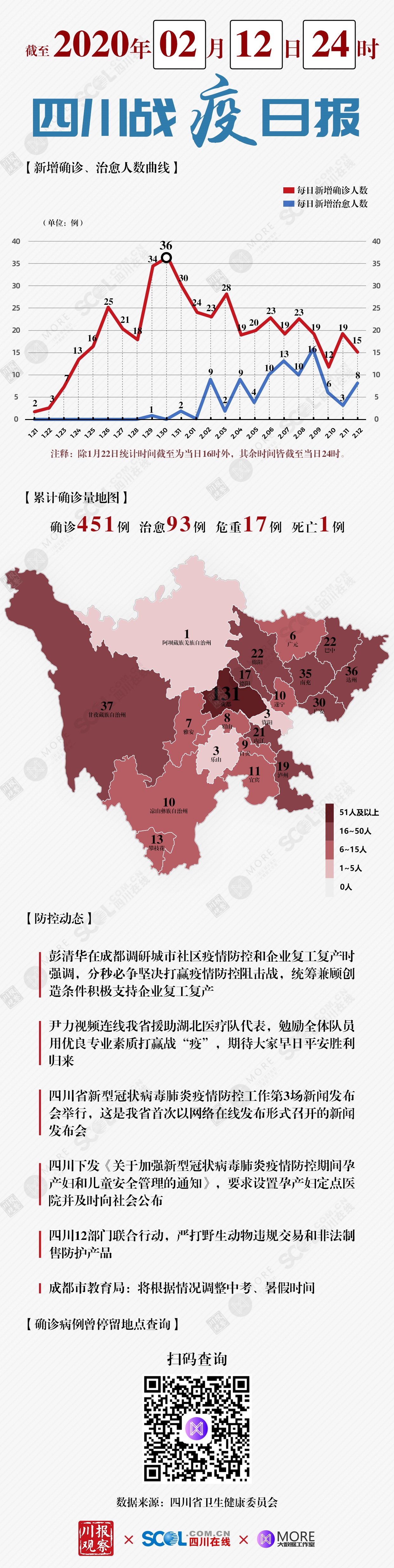 截至2月12日24时,四川省累计报告新型冠状病毒肺炎确诊病例451例,涉及21个市(州)、125个县(市、区)。