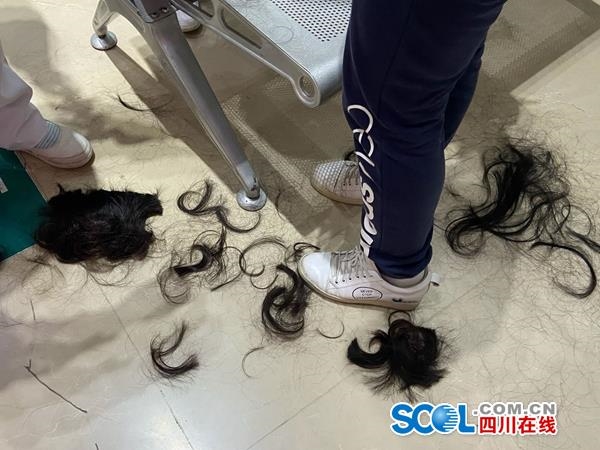2月13日一大早,西南医科大学附属医院(忠山院区)门诊大厅的地上散落着长短不一的头发,是正准备前往湖北支援的医疗救援队队员现场剪下的。有的医护人员干脆将长长的马尾辫一剪子剪到刚好能扎起的长度;有的将挨着颈部的头发剃了一半。