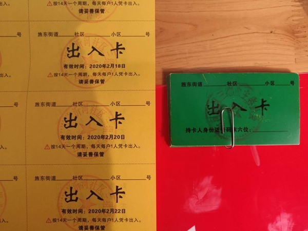 2月9日,德阳发布通告,要求对全市城乡居住小区(院落)实行封闭式管理。“沂河3组经过前期工作,其实已经实现了‘半封闭’。”朱兴萍说,在此基础上,按照旌东街道统一要求,沂河3组开始实行出入卡制度,其中绿卡配套身份证使用,可供上班族自由出入;黄卡以家庭为单位,一次性办理一套14张,每个家庭每天只能使用1张,供一人次出入。“这样可以避免居民因为购物、倒垃圾等反复出入,增强自我管理意识。”