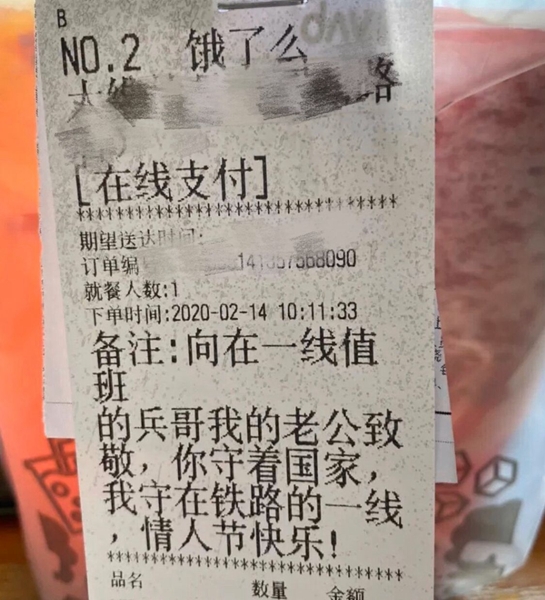 在成都,市民都积极响应号召“宅”在家中,不少小区已进行封闭式管理,凭卡出入。也有人因为工作原因,无法与家人相聚,不少情侣另辟蹊径用外卖互诉衷肠。