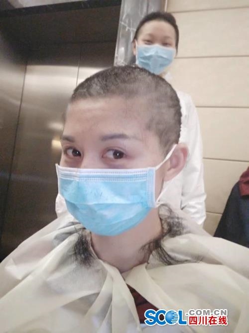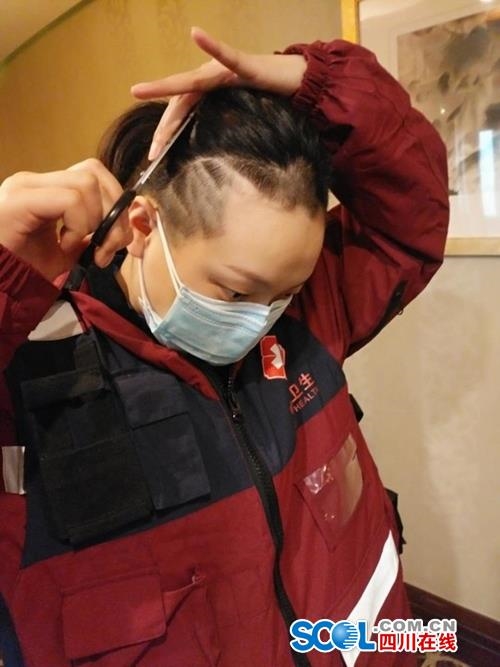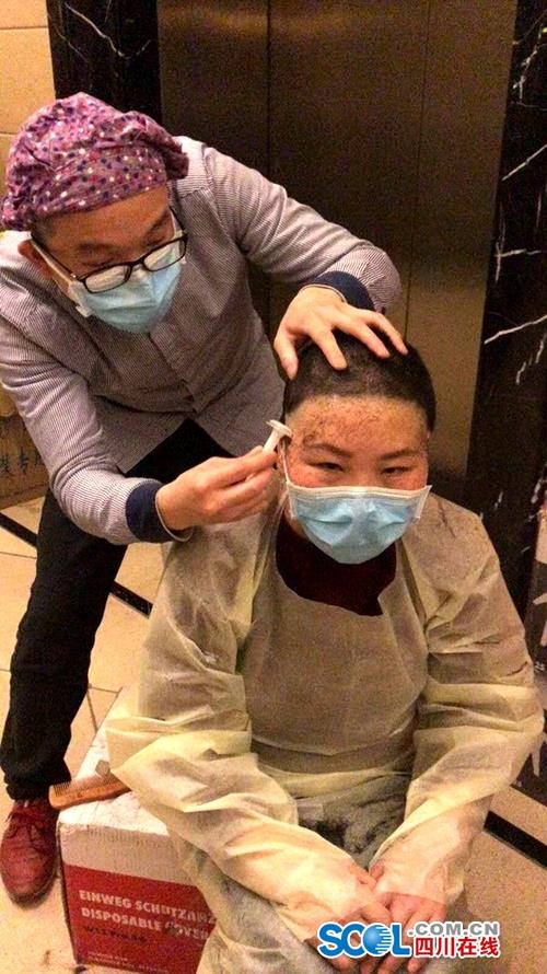 四川在线消息(饶春宝 记者 袁城霖)明天就要上“战场”了!2月14日下午,大竹县援助湖北医疗队队员在酒店剪掉留了多年的长发。