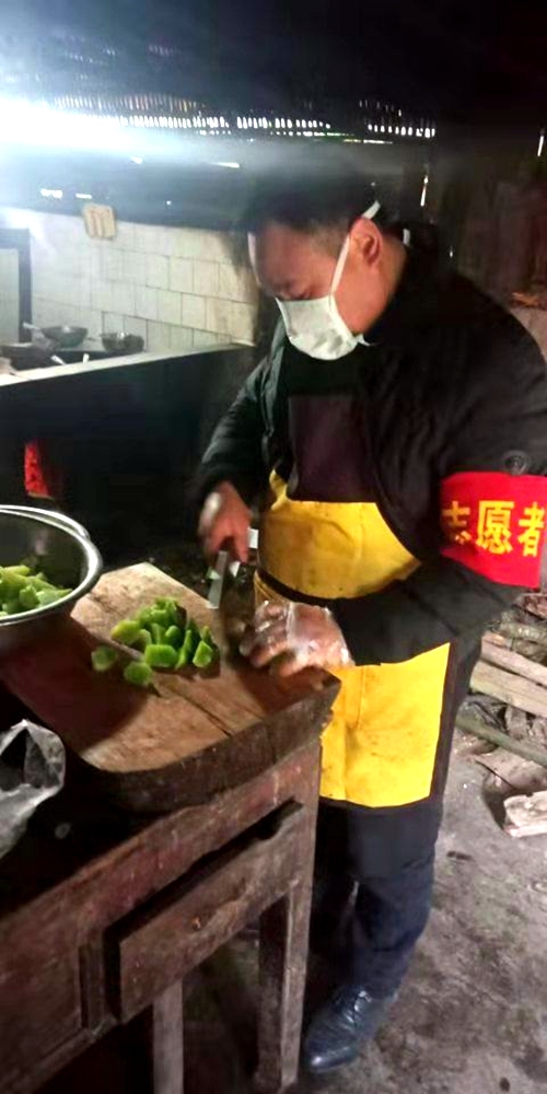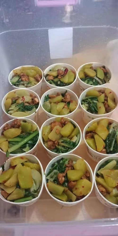 有了村里的支持,姜正洪师傅做起饭来也更有劲了。每天他从早上8点就开始在厨房忙碌起来,洗菜、切菜、炒菜、烧菜忙得不亦乐乎,按照“一荤两素一汤”的标准,11点半准时出锅。这样志愿者们就能在12点把饭菜送到一线防控人员手中,让他们准时吃上饭了。中午稍事休息,下午4点又开始忙碌起来,确保晚饭准时开餐。