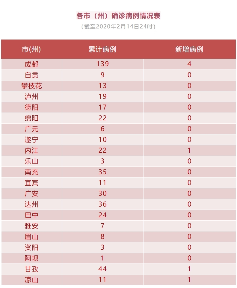 新增治愈出院病例中,宜宾市3例、内江市2例、成都市1例、广元市1例、南充市1例、广安市1例、凉山州1例。