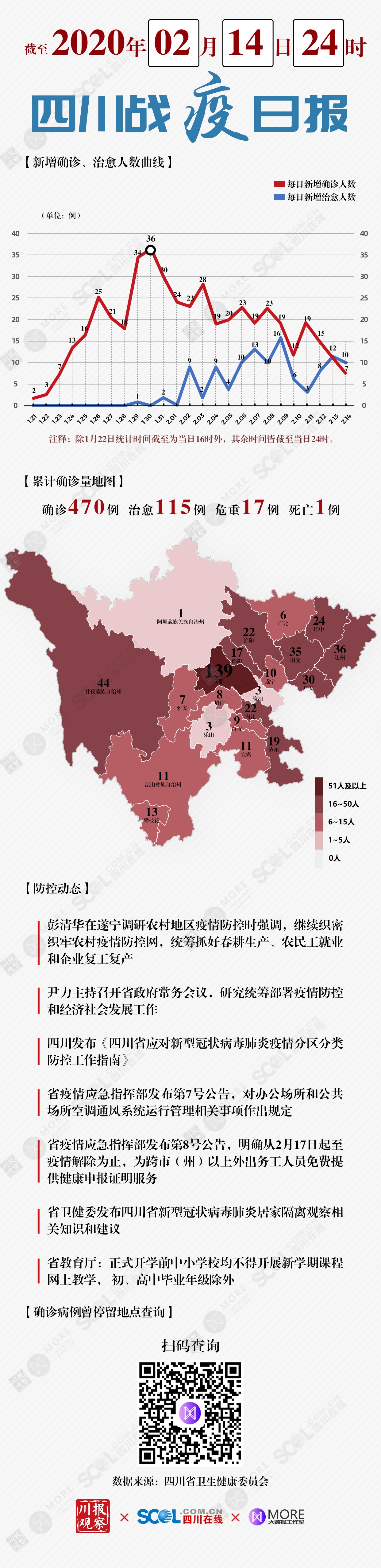 截至2月14日24时,四川省累计报告新型冠状病毒肺炎确诊病例470例,涉及21个市(州)、127个县(市、区)。