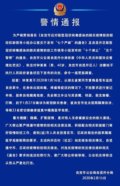 四川在线消息(刘亿 记者 秦勇)2月15日,记者从自贡市公安局自流井分局获悉,日前,该局依据《中华人民共和国治安管理处罚法》,依法对钟某某(男,40岁,自贡市自流井区人)涉嫌拒不执行人民政府紧急状态下发布的决定、命令一案受案调查。