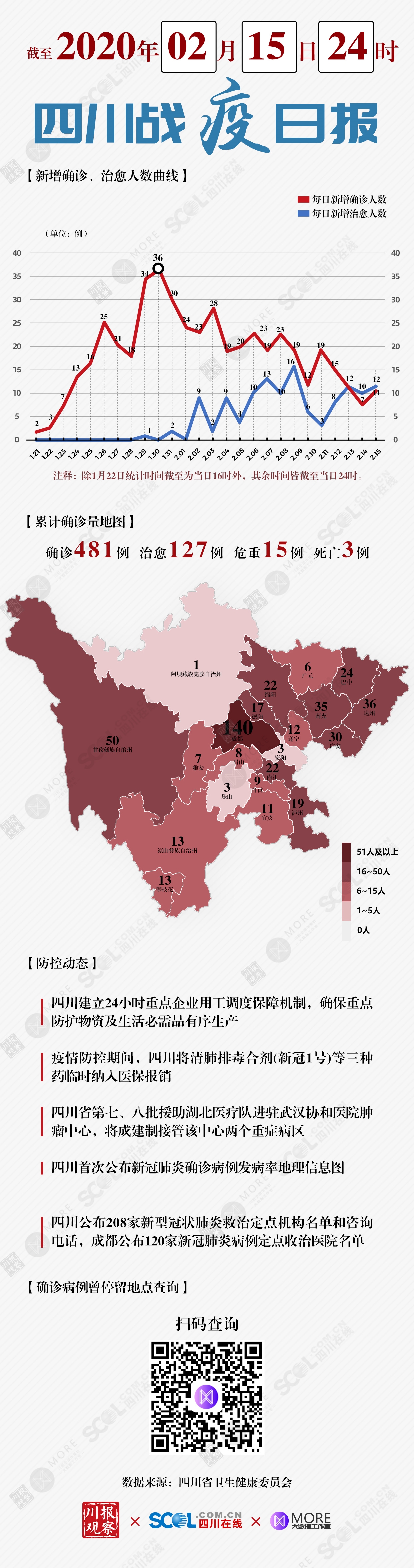 截至2月16日0时,四川累计报告新型冠状病毒肺炎确诊病例481例,涉及21个市(州)、128个县(市、区)。