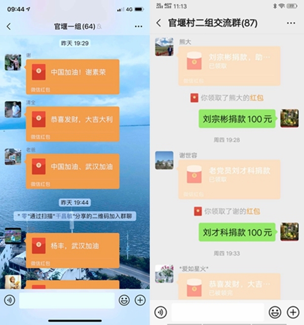 “抗击疫情,人人有责。我是一名共产党员,我要为抗击疫情尽自己的一点力量。这点钱是我的一点爱心。祖国加油!武汉加油!……”2月13日,成都高新区石板凳街道官堰4社村民李学渊在本社的微信群里发了红包,并发布了一条这样的信息。随后,1000元、100元、50元……不同金额的红包陆续发到群里,大家慷慨解囊,纷纷为抗击疫情奉献出自己的爱心。
