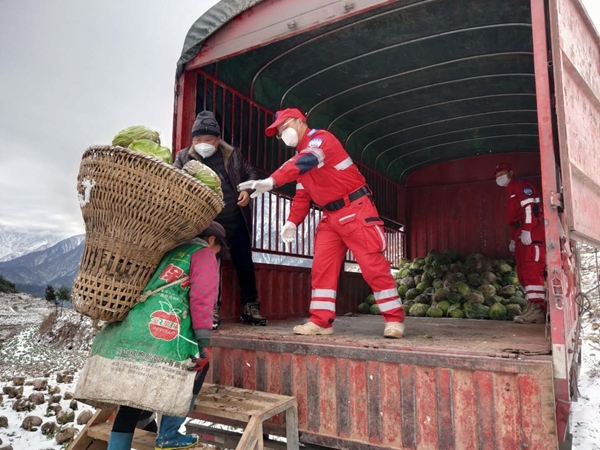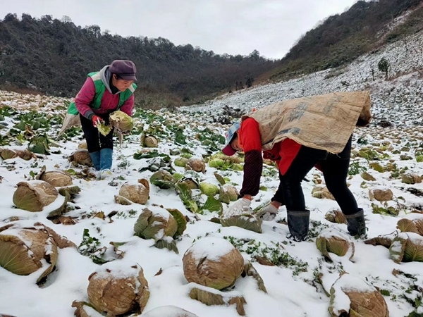 2月16日一大早, 峨边的菜农就上了山、进了菜地,他们把白雪轻覆下的莲花白掰下来,装进背兜,又传递到汽车上。