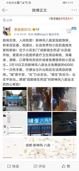 “宅在家什么都做不了,我总要努力做点事情。”于是,他在朋友圈和微博上发帖,客观且乐观地播报小区里发生互助的事和业主们的乐观心态,同时在抖音上怼那些不实的谣言视频。